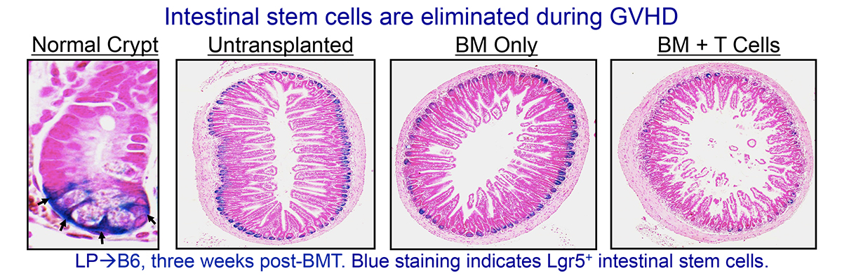 Our work has shown that GVHD of the intestines can lead to loss of the intestinal stem cells necessary for maintaining and regenerating the intestinal epithelium. Likewise, innate lymphoid cells (ILCs) produce IL-22 post-transplant to stimulate epithelial regeneration and maintain intestinal barrier function. However, we have found that GVHD leads to loss of both the intestinal stem cells and ILCs necessary for epithelial recovery.