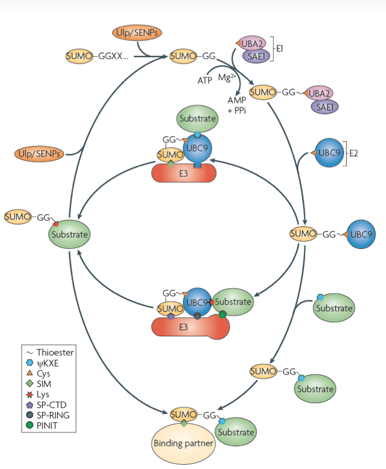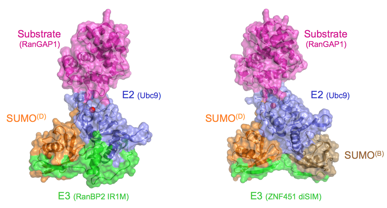 Unique combinations of E2s and E3s ensure specificity and enhance conjugation in the ubiquitin pathway. The SUMO pathway includes only one known E2 and just a few E3s. We employ structural and biochemical tools to uncover the basis for substrate specificity for non-RING and RING E3s that differ in their ability to selectively target substrates for modification. One early study revealed the kinetic basis for E3 ligase domains within the Nup358/RanBP2 nucleoporin, including structural characterization of a complex between human Nup358/RanBP2, the SUMO E2 Ubc9, and SUMO-1 conjugated RanGAP1. This study revealed that the E3 organized the charged E2-thioester to promote conjugation, a feature shared with many other ubiquitin and ubiqutin-like E3 ligases. Subsequent studies revealed a structural basis for the ZNF451 SUMO E3 ligase, and the structural basis for substrate recognition in an activated RING-type SUMO E3 ligase.