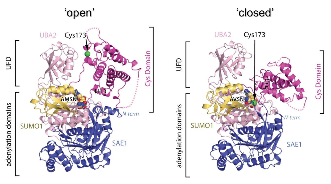 E1 enzymes facilitate conjugation of ubiquitin and ubiquitin-like proteins through adenylation, thioester transfer within E1, and thioester transfer from E1 to E2 conjugating proteins. Early work determined structures of the SUMO E1 in complex with SUMO and ATP and elements required for E2 recruitment, however the E1 active site cysteine was positioned to far from the SUMO C-terminus to explain the second reaction, thioester bond formation, suggesting that additional changes within the adenylation site were required to promote adenylation and subsequent thioester transfer. Subsequent work revealed the structural basis for requisite conformational changes through application of chemical probes that mimicked unstable intermediates in the pathway, showing that the E1 active site is uniquely remodeled to promote adenylation and thioester bond formation. We also determined the structural basis for ubiquitin E1-E2 thioester bond formation.