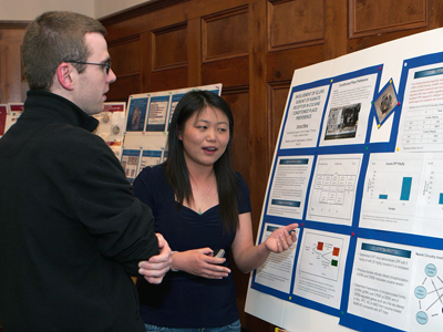 Chris Stratton listens as first-year pharmacology student Yanran Wang presents her work