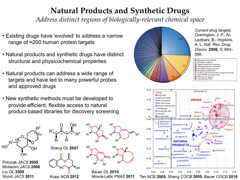 In the area of diversity-oriented synthesis, we are developing discovery libraries based on privileged structural motifs from natural products. Such structures have a demonstrated ability to bind diverse biological targets, including challenging targets that are intractable to conventional synthetic drug-like molecules. Moreover, they have distinct structural features compared to existing synthetic drugs, and these same features have been correlated with improved clinical success. Thus, these natural product-based libraries are designed to access underexploited regions of chemical structure space to address a complementary spectrum of biological targets compared to conventional synthetic drugs. Importantly, many of the existing approaches to synthesizing these structures are unsuitable for diversity-oriented synthesis, due to the exceptional requirements for reaction efficiency and flexibility. Thus, we are presented with numerous opportunities to develop new chemical methodologies with broader applications in organic synthesis. Our current synthetic targets include spiroketals, polycyclic alkaloids, macrocycles and medium rings, and oxygen heterocycles.