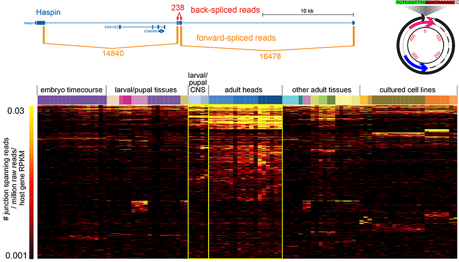 Circularization was recently recognized to broadly expand transcriptome complexity. We exploited massive Drosophila total RNA-sequencing data (>5 billion paired-end reads from >100 libraries covering diverse developmental stages, tissues and cultured cells) to rigorously annotate >2500 fruitfly circular RNAs (Figure 2). These mostly derive from back-splicing of protein-coding genes and lack poly(A) tails, and circularization of hundreds of genes is conserved across multiple Drosophila species. We elucidate structural and sequence properties of Drosophila circular RNAs, which preferentially derive from neural genes and exhibit enhanced accumulation in neural tissues. Interestingly, circular isoforms increase dramatically relative to linear isoforms during CNS aging, and constitute a novel aging biomarker. We are interested to analyze more about the mechanisms of circularization and potential biological activities.