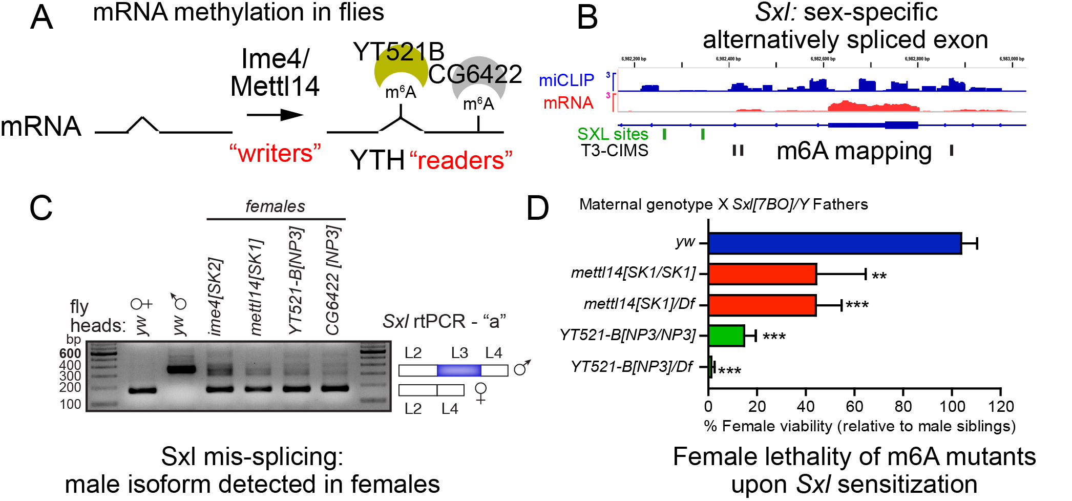 Since most studies of this pathway have been conducted in cultured cells, we established the Drosophila as a powerful system that can combine genetics, biochemistry, and genomics to elucidate in vivo biology of RNA methylation. We used miCLIP to map m6A across embryogenesis, characterize its m6A “writer” complex and YTH readers, and used CRISPR/Cas9 to mutate all the m6A factors. While m6A factors with additional roles in splicing are lethal, m6A-specific mutants are viable but present certain developmental and behavioral defects. Notably, we find that m6A working through the nuclear reader YT521-B facilitates sex-specific splicing of the master female determinant Sxl (Figure 3). In the future, we are interested to use these molecular and genetic toolkit to elucidate other aspects of in vivo m6A biology.