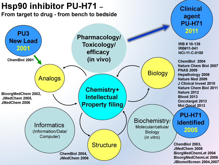 We also use the chemical tools to tailor them into companion diagnostics and potential drugs for cancer and other diseases such as in neurodegeneration. No invention becomes a drug or a diagnostic without strong intellectual property and a commercialization plan behind it; therefore, my lab is directly involved in writing and maintaining the over 550 patent applications and granted patents covering our portfolio and is behind the creation of start-ups to develop the inventions toward the clinic and the market. So far, we have translated to clinic the PU-H71 inhibitor and its companion diagnostics PU-PET and PU-FITC; this agent, together with the companion diagnostics is now in Phase 1b/2 clinical studies (Cancer Cell 2019, JCO Precision Oncology 2020, npj Precision Oncology 2021). To advance this portfolio, we have formed a startup, Samus Therapeutics Inc. Recently we have translated to clinic the CNS directed diagnostic 124I-PU-AD PET, and the therapeutic, PU-AD, for the treatment of Alzheimer’s disease (now in Phase 2 studies, Nature Comm 2020), the therapeutic Icapamespib in glioblastoma (Phase 1b, Nature Comm 2021) and are moving forward alternative approaches of targeting the epichaperomes (via targeting Glyc62GRP94 and via allosteric HSP70 targeting).