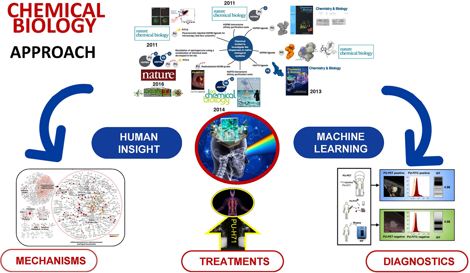 The goal of my program is to investigate stressor maladaptation mechanisms such as they occur in several diseases. Our approach takes advantage of the way nature has evolved to control such stressors, and that is by a unique usage of the chaperome, referred here as the epichaperome. The epichaperome, which we discovered, is structurally, dynamically and functionally distinct from the housekeeping chaperome, and my lab has pioneered an approach to take advantage of such features. By using innovative methods, we develop small molecule chemical toolsets specifically targeted to the epichaperome; these act as “sensors” of the epichaperome, and in turn, of the chronic stressor-associated proteome-wide malfunctions. By the use of these unique toolsets we aim to understand, diagnose and treat cellular processes associated with chronic stressors. We address multiple mechanistic and biochemical questions less amenable to approaches that treat the chaperome as monolithic entity (i.e. the classical biochemical and genetic tools). We investigate in endogenous systems, both at the cellular and the organismal level, the inherent proteome changes and mechanisms that lead to disease, i.e. we can understand. By sensing disease states through the chemical toolsets, we go beyond investigation; we identify, measure and quantify, i.e. we can diagnose. By attacking the epichaperome specifically, we perturb the disease-causing proteome, and in turn revert or slow the disease phenotype, i.e. we can treat.