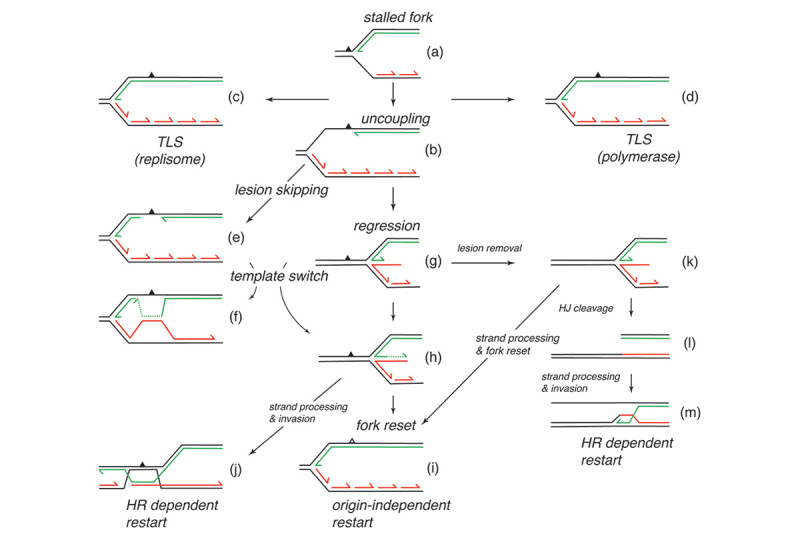 Damage in the leading-strand template is more problematic (Fig. 1). When a replisome first stalls at leading-strand template damage, the situation drawn in Fig. 1a obtains. At this juncture the nascent lagging strand has not yet caught up with the stalled leading strand. There are many different pathways that can be operative once the replisome has stalled (Fig. 1). We have used replication systems reconstituted with purified E. coli replication proteins and DNA templates carrying a single, site-specific cyclopyrimidine dimer (CPD) to analyze the events that occur after the replisome stalls. A major finding was that the template damage was only a transitory block to replication fork progression. Template unwinding and lagging-strand synthesis continued at a reduced rate downstream of the damage, exposing the leading-strand template in single-stranded form. A subsequent de novo priming event on the leading-strand template allows the stalled leading-strand polymerase to cycle forward to the new primer terminus and coordinated replication then continues downstream (Fig. 1a to 1b to 1e and Fig. 2). Thus, the replisome bypasses the template damage in a reaction termed “lesion skipping” leaving a gap behind. These studies indicated that the replisome was therefore inherently DNA damage-tolerant.