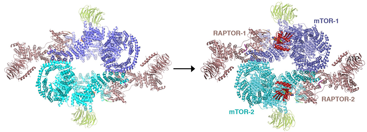 The mammalian target of rapamycin (mTOR) protein, a member of the phosphoinositide 3-kinase (PI3K)-related protein kinase (PIKK) family, has a central role in two growth-regulatory pathways that have distinct inputs and downstream effectors. In one pathway, mTOR assembles with its RAPTOR subunit to form mTOR Complex 1 (mTORC1), while in the other pathway RAPTOR is replaced by RICTOR to form mTORC2. mTORC1 activation requires nutrients, which are sensed as amino acid levels and induce mTORC1 recruitment to lysozomal membranes through RAPTOR. There, mTORC1 meets its activator, the small GTPase RHEB, which conveys a second set of signals from environmental cues including energy, oxygen levels, and growth factors. In metazoan, growth factors are also needed to relieve the inhibition of mTORC1 by PRAS40. In earlier work, we had determined the crystal structure of truncated mTOR containing the kinase domain and the associated FAT domain shared with all PIKKs. This established the PIKK kinase catalytic mechanism and also revealed that the binding site for the immunosuppressant/antiproliferative agent rapamycin is a highly conserved site adjacent to the catalytic cleft, raising the question of whether it is a substrate-recruitment domain (Yang et al., 2013). This we confirmed with a crystal structure of the rapamycin-binding domain bound to a substrate-peptide.