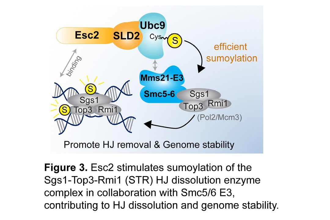 Recombinational Repair and Its Interface with Replication. DNA templates contain large numbers of barriers that impede replisome progression. Some examples of these barriers include DNA lesions generated endogenously or induced by carcinogens, DNA secondary structures, or transcriptional blockade. A large number of accessory proteins can help the replisome to overcome these barriers or fill ssDNA gaps left by failed replisomes. Recombinational repair proteins have roles in both processes. We found that some recombination enzymes can promote replication fork reversal, providing one way for replisomes to overcome barriers, and we showed that this activity is tightly regulated by the Smc5/6 complex (Xue et al Mol Cell 2014). Further, recombinational repair can fill ssDNA gaps and generate join DNA molecules called Holliday junctions (HJs). HJs must be processed into linear DNA for successful completion of repair. We revealed that HJ processing is controlled by multiple factors such as Smc5/6 and the Esc2 protein (Li et al Genes Dev 2021; Bonner et al Cell Rep 2016) (Figure 3) These discoveries made by BCMB PhD students and Postdocs have poised us to delve deeper into the interface between replication and recombinational repair.