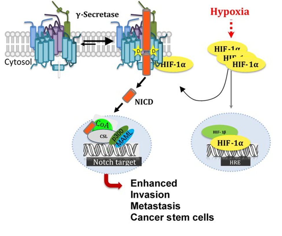 Our lab has uncovered a novel non-transcriptional role of HIF-1α interacting with and activating γ-secretase. This interaction between HIF-1α and γ-secretase has been shown by our lab to increase Notch signaling in breast cancer, exacerbating cancer progression by increasing invasion, migration, metastasis and an increase in cancer stem cells. Additionally, we have shown that Hif1α upregulates BACE1 and γ-secretase activity for Aβ production in hypoxic brain conditions. These results implicate Hif1α as a therapeutic target for AD [13].