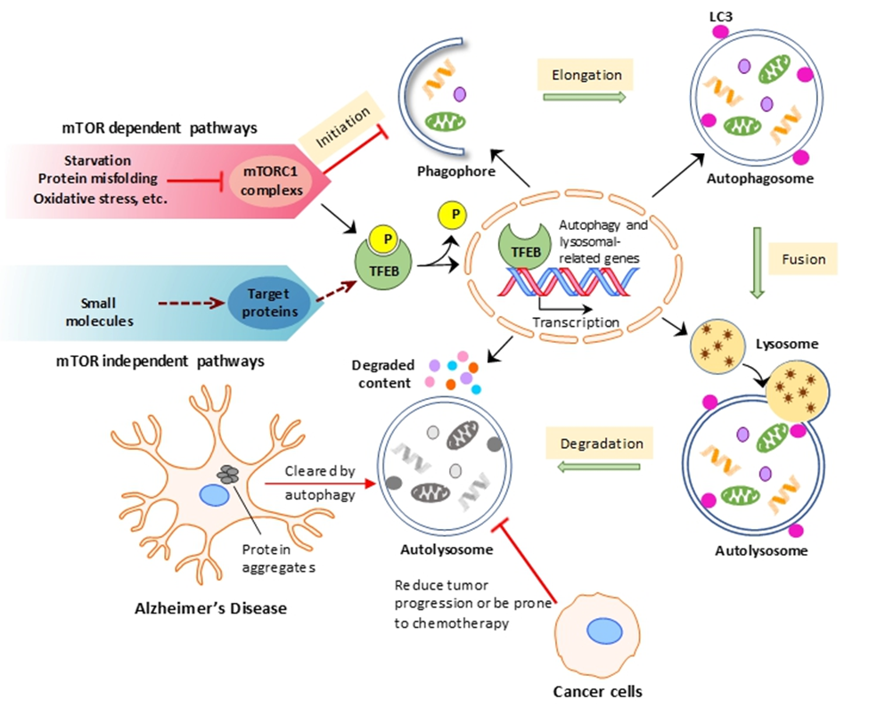 Autophagy, a highly regulated pathway, is entered by cells under various conditions including starvation, protein misfolding and oxidative stress. Transcription factor EB (TFEB) has been shown to be the master regulator of the autophagic-lysosomal pathway. Under normal conditions TFEB is phosphorylated by mTORC1 and remains in the cytoplasm. Inactivation of mTORC1 in this pathway thus leads to translocation of TFEB into the nucleus, where it initiates autophagic and lysosomal-related gene expression [15]. Due to increasing reports implicating autophagy in the clearance of tau aggregates in Alzheimer’s disease and in the promotion of tumor progression in various types of cancer, as well as in studies demonstrating the downsides of long-term mTOR, our lab investigates small molecules as autophagic inducers to promote autophagic flux through mTOR independent pathways [16-18]. Our goal is to use autophagic modulators as therapeutic drug treatments for these diseases.