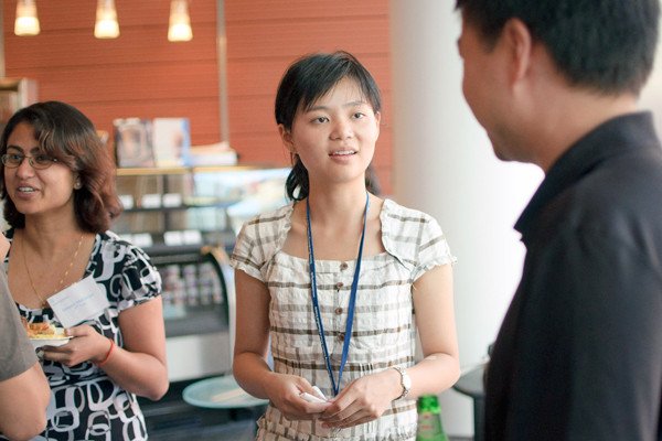 First-year PhD student Marta Kovatcheva meets fellow students and faculty at the Welcome Reception for first-year PhD students.